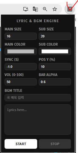 * GM과 PL 모두 가사 탭을 키고 있는 상태여야 합니다. 가사 탭에서 신호를 주고 받아 자막이 올라오는 형태입니다.